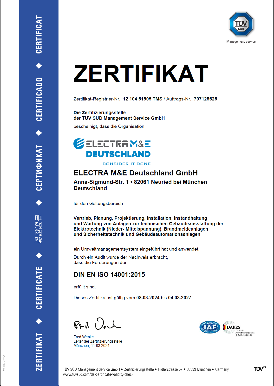 Electra M&E Deutschland verfügt über folgende Zertifikate, die unsere Anwendung höchster Qualitätsstandards bestätigen.